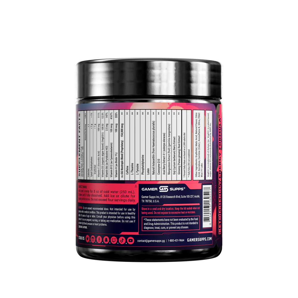 GG® is the ultimate energy and focus formula designed to Level Up Your Gaming. The highest quality ingredients make up an energy formula that mixes completely and provides a healthier and more cost effective energy drink.